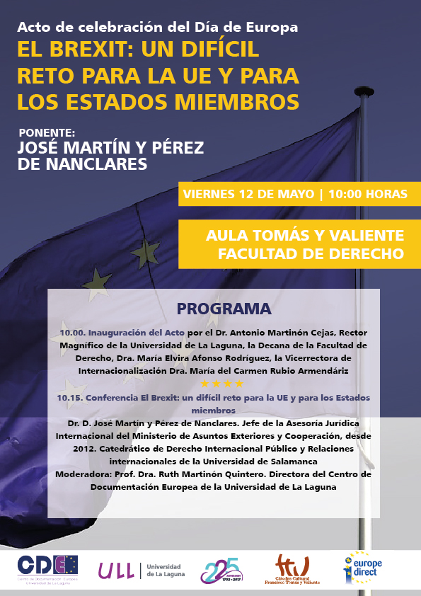 Esta conferencia supone el acto central de la celebración del Día de Europa (9 de mayo) en la institución académica. La actividad será inaugurada por el rector de la ULL, Antonio Martinón Cejas; la vicerrectora de Internacionalización, María del Carmen Rubio Armendáriz; y la decana de la Facultad de Derecho, María Elvira Afonso Rodríguez.