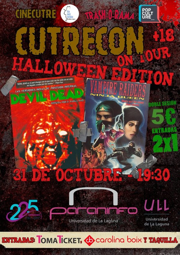 El Festival Cutrecon, dedicado a películas serie Z, aterriza en el Paraninfo de la Universidad de La Laguna mañana, martes 31 de octubre, con una doble sesión que comenzará a las 19:30, en la que se proyectarán “clásicos” de la caspa horrorosa asiática: “Devil Dead”, la versión de serie Z hindú de la “Evil Dead” de Sam Raimi; y “Vampire Raiders Ninja Queen”, ambas por cortesía del sello de distribución especializado en este tipo de cine Trash-O-Rama.
