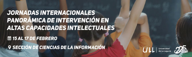 La Universidad de La Laguna, en colaboración con el Colegio Oficial de Psicología de las Palmas, organiza las Jornadas Internacionales sobre Panorámica de Intervención en Altas Capacidades Intelectuales, que se desarrollarán entre el 15 y el 17 febrero en la Sección de Ciencias de la Información de la Facultad de Ciencias Políticas, Sociales y de la Comunicación. El comité organizador está presidido por África Borges del Rosal, del Departamento de Psicología Clínica, Psicobiología y Metodología y vicepresidido por Elena Rodríguez Navieras, del mismo departamento.