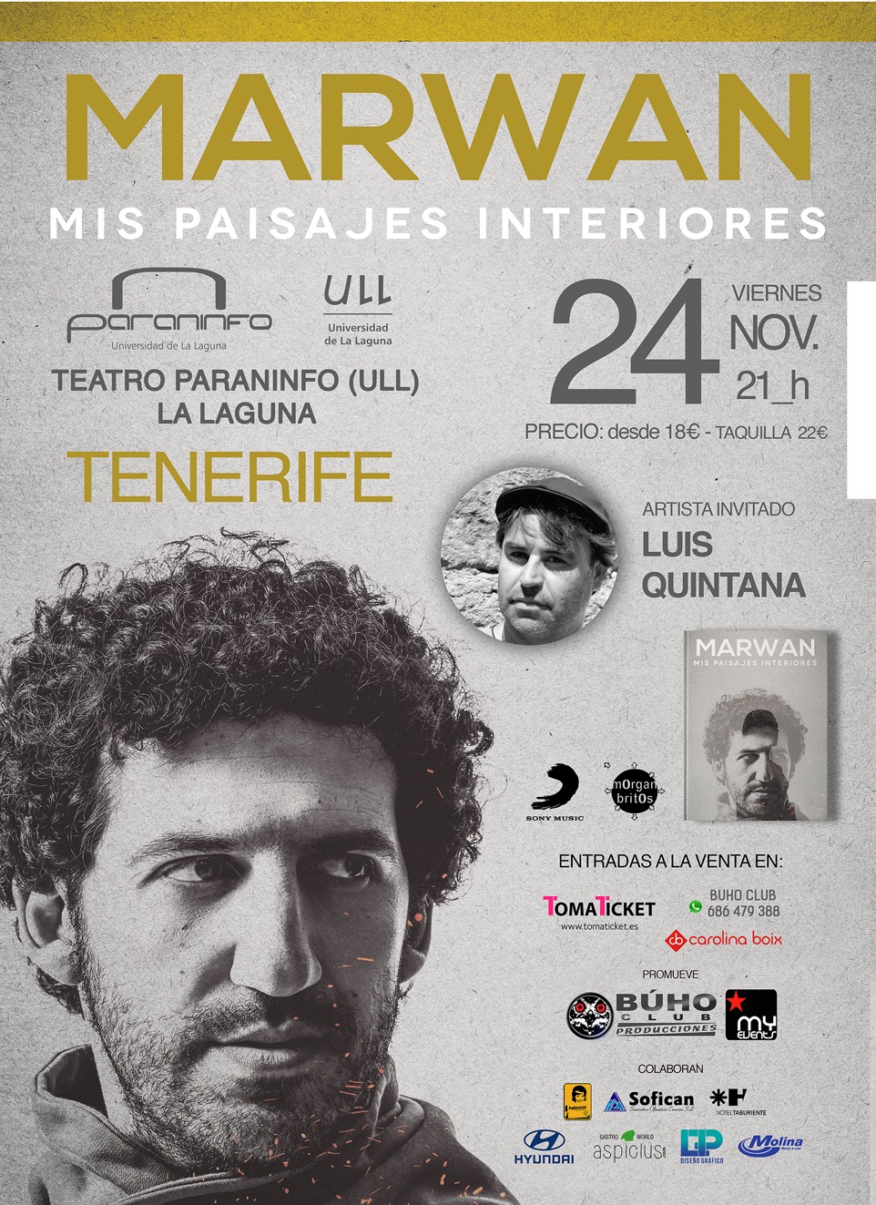 El Paraninfo de la Universidad de La Laguna acoge mañana, viernes 24 de noviembre a partir de las 21:00, la gira “Mis paisajes interiores” del cantautor Marwan, recital que agotó sus localidades a los pocos días de ponerse a la venta las entradas. Con este lleno absoluto del espacio universitario, el artista hará sonar las once canciones y el poemario inspirado en cada uno de los temas de este nuevo trabajo,