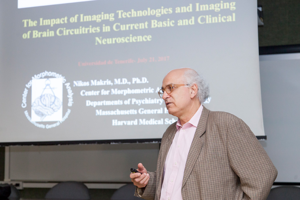 Nikos Makris, profesor de psiquiatría y neurología de la Harvard Medical School, participó el pasado viernes 21 de julio en el coloquio organizado por el Instituto Universitario de Neurociencia (IUNE) de la Universidad de La Laguna, en donde impartió la ponencia titulada: “El impacto de las tecnologías de imagen e Imagen de circuitos cerebrales en Básico y Neurociencia Clínica”.