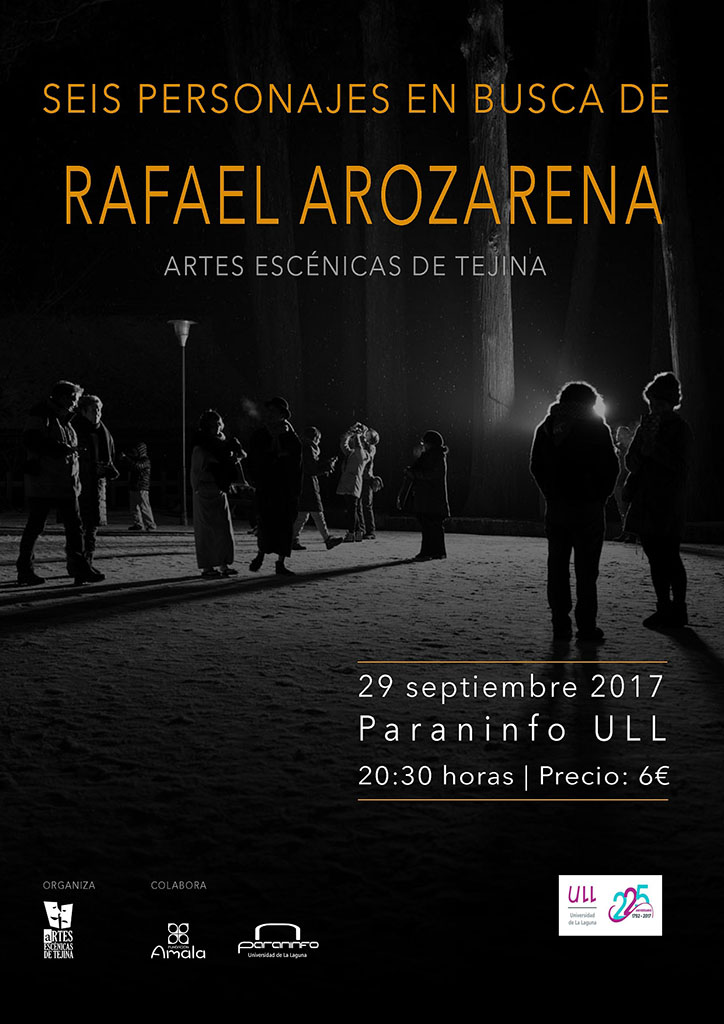 El Paraninfo de la Universidad de La Laguna acoge hoy, viernes 29 de septiembre a las 20:30 horas, la representación de la obra Seis personajes en busca de Rafael Arozarena, de la agrupación Artes Escénicas de Tejina. El director Oswaldo Bordón lleva al espacio universitario una función que escenificará el ensayo de la versión –en pequeño formato– de “Mararía”. En el transcurso de este ensayo, por el patio de butacas aparecerán algunos de los personajes más significativos de la obra de Arozarena para reivindicar su drama inacabado.