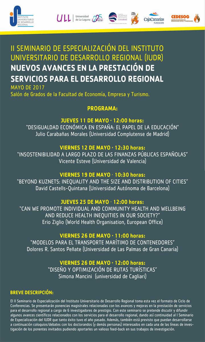 Paralelamente, el Centro de Estudios de Desigualdad Social y Gobernanza (CEDESOG), también de la ULL, ha organizado el “I Seminario de Investigación en Desigualdad Social, Movilidad Intergeneracional y Desarrollo”, cuyo programa lo componen tres de las conferencias del seminario del IUDR: concretamente, la de mañana, 11 de mayo, a cargo de Julio Carabañas Morales; la del 19 de mayo, por David Castells-Quintana; y la del viernes 26, por Erio Ziglio.