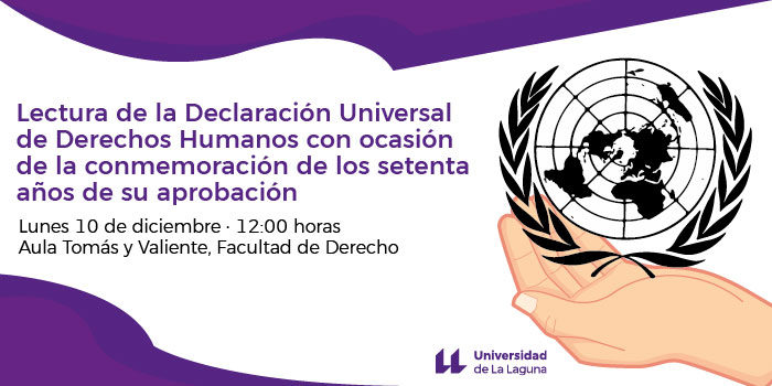 La Asamblea General de las Naciones unidas adopto en París, el 10 de diciembre de 1948, la Declaración Universal de los Derechos Humanos. Setenta años después, la Universidad de La Laguna ha querido hacerse eco de este aniversario con un acto que se celebrará el próximo lunes, 10 de diciembre a las 12:00 horas en el Aula Tomás y Valiente de la Facultad de Derecho, consistente en la lectura de este importante documento por parte de personas adscritas a los diferentes colectivos que conforman la comunidad universitaria.