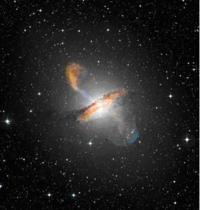 Composición de imágenes en el óptico (ESO/WFI), submilimétrico (MPIfR/ESO/APEX) y rayos X (NASA/CXC/CfA) de Centauro A.