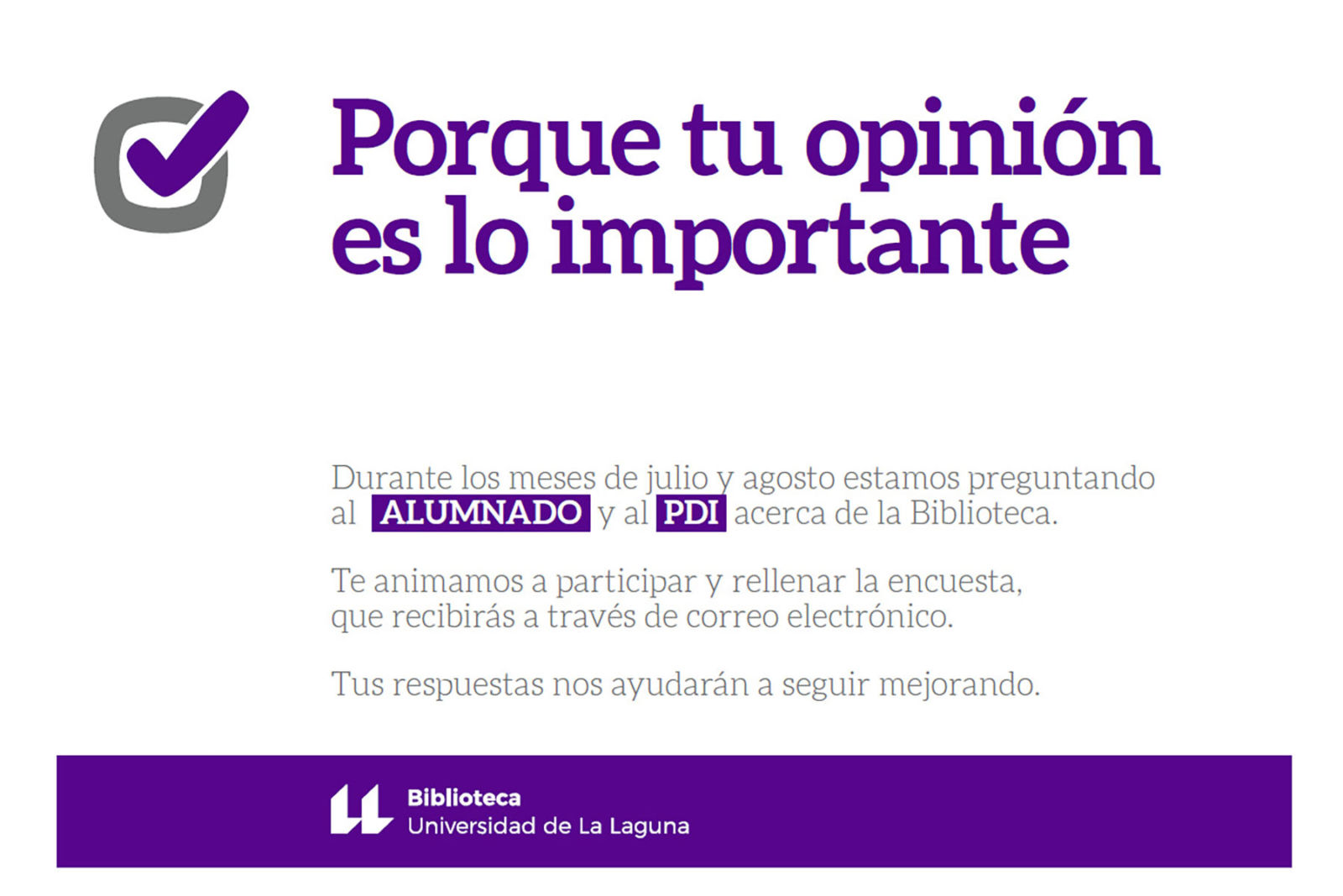 Si pertenecen al alumnado o al PDI de la Universidad de La Laguna, estos días recibirán un correo electrónico de la Unidad de Calidad con una encuesta sobre el servicio de Biblioteca. Cumplimentarla solo les llevará unos minutos y sus respuestas son muy importantes para nosotros.