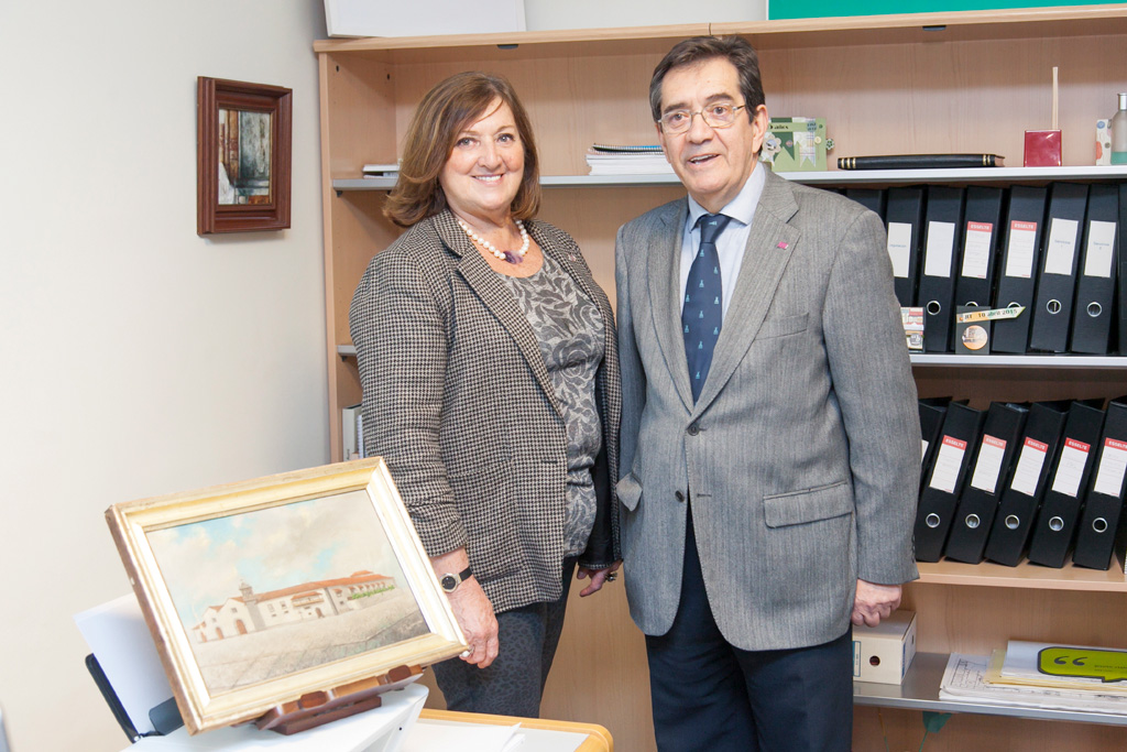 La presidenta de Alumni ULL y el rector posan junto al cuadro de Robayna donado a la ULL.