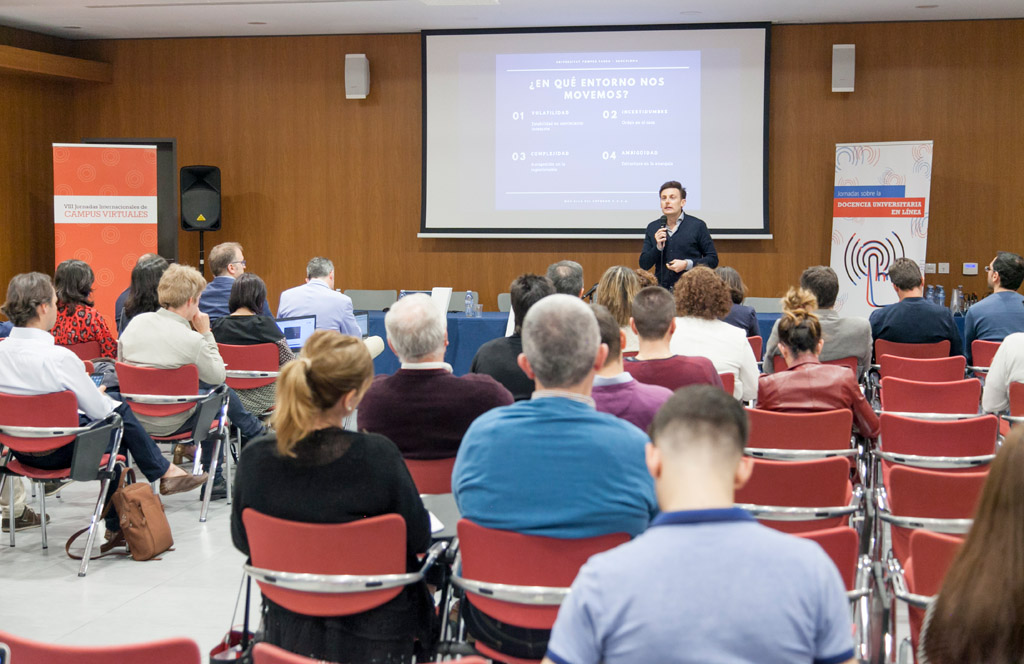 El ponente incidió a lo largo de su ponencia en varios ejemplos para recalcar la idea de que el aprendizaje debe ser activo, dinámico, cambiante y creativo. Por ello, las herramientas digitales y los campus virtuales deben estar pensados para facilitar la generación de conocimiento y de tecnología por parte del propio alumnado.
