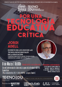 La Cátedra Fundación MAPFRE Guanarteme de Tecnología y Educación de la Universidad de La Laguna, conocida por el acrónimo TECNOEDU, ha organizado un ciclo de conferencias que, bajo la denominación de “Jueves Digitales”, se desarrollará entre marzo y junio de 2018 para abordar diversas materias relacionadas con el mundo digital y los entornos docentes. El próximo jueves, 8 de marzo, el invitado será el profesor de la Universidad Jaume I de Castellón Jordi Adell.