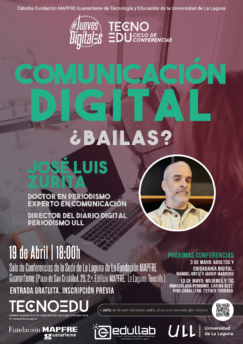 La Cátedra Fundación MAPFRE Guanarteme de Tecnología y Educación (TECNOEDU) de la Universidad de La Laguna organiza un ciclo de conferencias denominado “Jueves Digitales”, en el cual se abordan temáticas relacionadas con la sociedad, la educación y la tecnología. La próxima ponencia, a cargo del periodista y profesor de la ULL José Luis Zurita, lleva por título “Comunicación Digital, ¿Bailas?” y se celebrará el jueves 19 de Abril a las 18:00 horas en la sede de la Fundación MAPFRE Guanarteme, en La Laguna. Como en los anteriores casos, la entrada será gratuita mediante inscripción previa desde la web de la cátedra.
