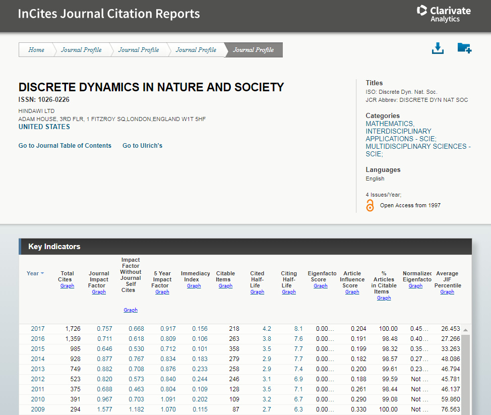 Les comunicamos que Clarivate Analytics ya ha dado a conocer la actualización con los datos 2017 de Journal Citation Reports (JCR), el recurso más influyente y completo para obtener información sobre las publicaciones altamente citadas y revisadas por pares. Ahora mismo incluye datos de las 14.000 revistas indexadas en Science Citation Index Expanded (SCIE) y Social Sciences Citation Index (SSCI), de la Web o Science (WoS).