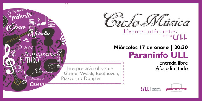 El Paraninfo de la Universidad de La Laguna acogerá mañana, miércoles 17 de enero, el ciclo de música Jóvenes Intérpretes de la ULL, un concierto en el que se interpretarán obras de Ganne, Vivaldi, Beethoven, Piazzola y Doppler. Como es habitual, el recital dará comienzo a las 20:30 horas y la entrada es libre, si bien hay que tener en cuenta que el aforo es limitado.