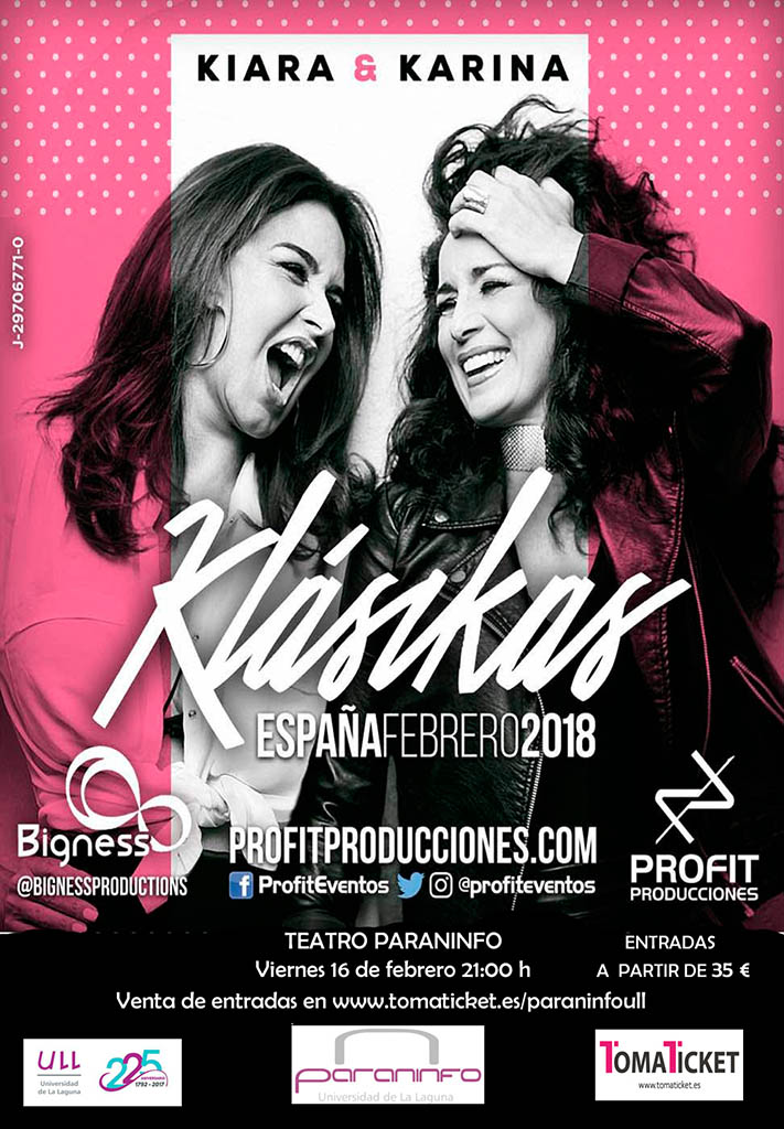 El Paraninfo de la Universidad de La Laguna acogerá mañana viernes 16 de febrero un concierto de la gira titulada Klásicas, con la que las cantantes venezolanas Kiara y Karina han puesto en marcha su ‘tour’ español en este 2018. El recital de las estrellas del pop venezolano de los 80 dará comienzo a las 21:00 horas y será el único en Canarias de esta gira. Las entradas se pueden retirar, como es habitual, en www.tomaticket.es/paraninfoull, al precio de 35 euros.