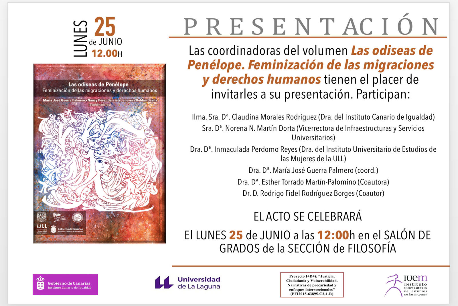 El Salón de Grados de la Sección de Filosofía acogerá el lunes 25 de junio a las 12 horas la presentación del libro Las odiseas de Penélope. Feminización de las migraciones y derechos humanos, escrito por investigadores de varias universidades y coeditado por las universidades de La Laguna y Autónoma de México.