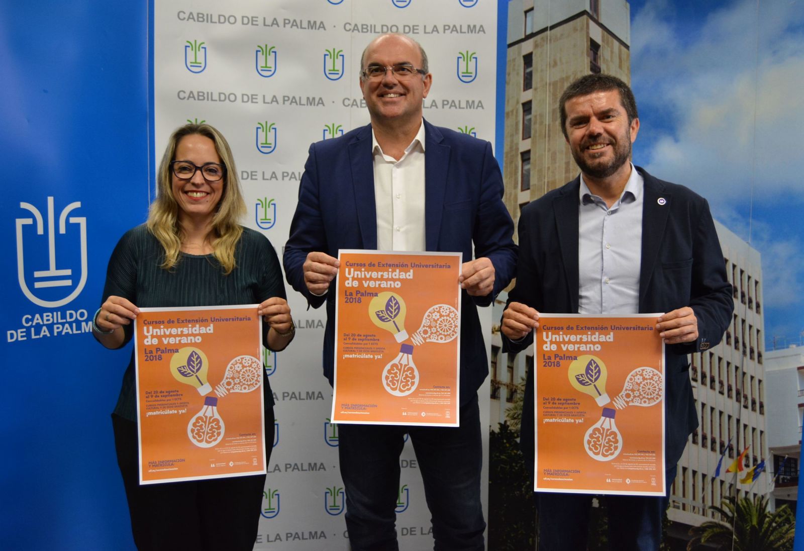 La Universidad de Verano de La Palma 2018 ha sido presentada hoy en rueda de prensa por el presidente del Cabildo de La Palma, Anselmo Pestana, acompañado por la consejera de Educación, Susana Machín, y el vicerrector de Relaciones con la Sociedad de la ULL, Francisco Javier García.