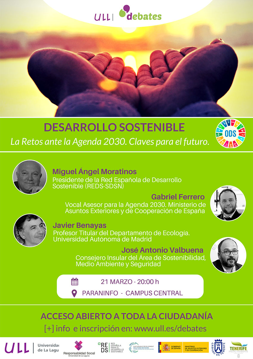 El ciclo ULL Debates, promovido por el Vicerrectorado de Relaciones con la Sociedad de la Universidad de La Laguna, celebrará mañana, miércoles 21 de marzo a las 20:00 horas en el Paraninfo una nueva sesión, esta vez en torno al desarrollo sostenible y los retos que supone la Agende 2030. El ponente principal será el diplomático Miguel Ángel Moratinos, ministro de Asuntos Exteriores entre 2004 y 2010 y actualmente presidente de la Red Española de Desarrollo Sostenible (REDS-SDSN).