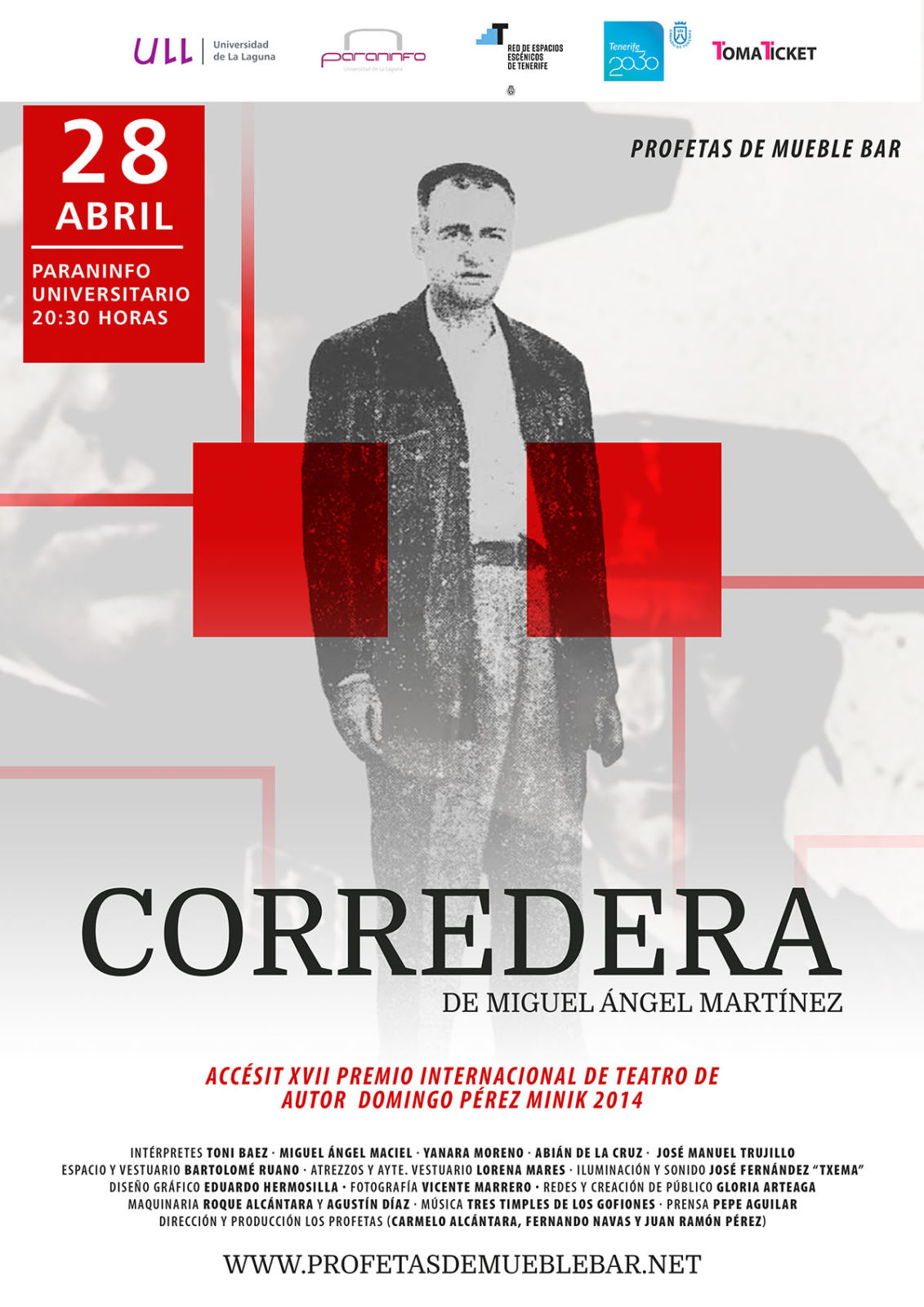 La compañía teatral Profetas de Mueble Bar llevará a escena mañana sábado, 28 de abril a las 20:30 horas, en el Paraninfo de la Universidad de La Laguna la obra Corredera, texto de Miguel Ángel Martínez que obtuvo un accésit en el XVII Premio de Teatro de Autor Domingo Pérez Minik y que da la palabra a ese hombre sencillo que se convirtió en mito para la memoria colectiva al ser el último fugitivo y ejecutado por garrote vil en Canarias.
