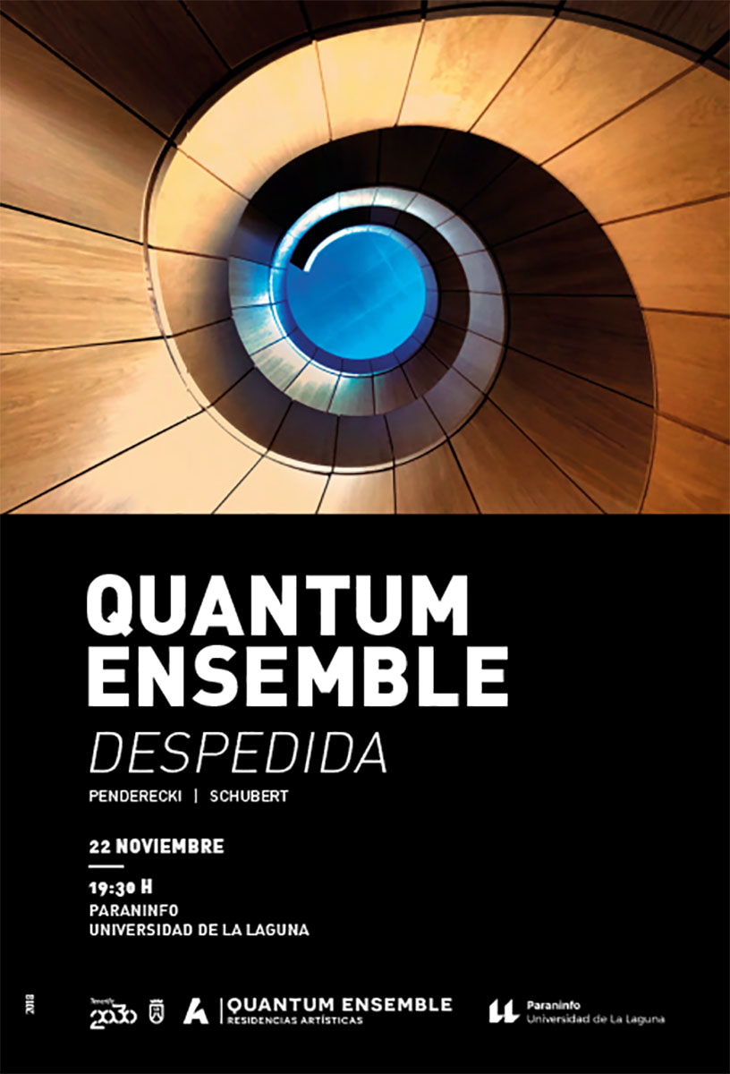 Quantum Ensemble, conjunto residente de música clásica del Auditorio de Tenerife, ofrecerá el recital Despedida mañana jueves, día 22 de noviembre, a partir de las 19:30 horas en el Paraninfo de la Universidad de La Laguna (ULL). El programa se desarrollará en dos partes, con una primera dedicada al Cuarteto para clarinete y trío de cuerdas del compositor y director de orquesta clásico polaco Krzysztof Penderecki y una segunda centrada en el Quinteto para cuerdas en Do mayor del compositor austriaco Franz Schubert.