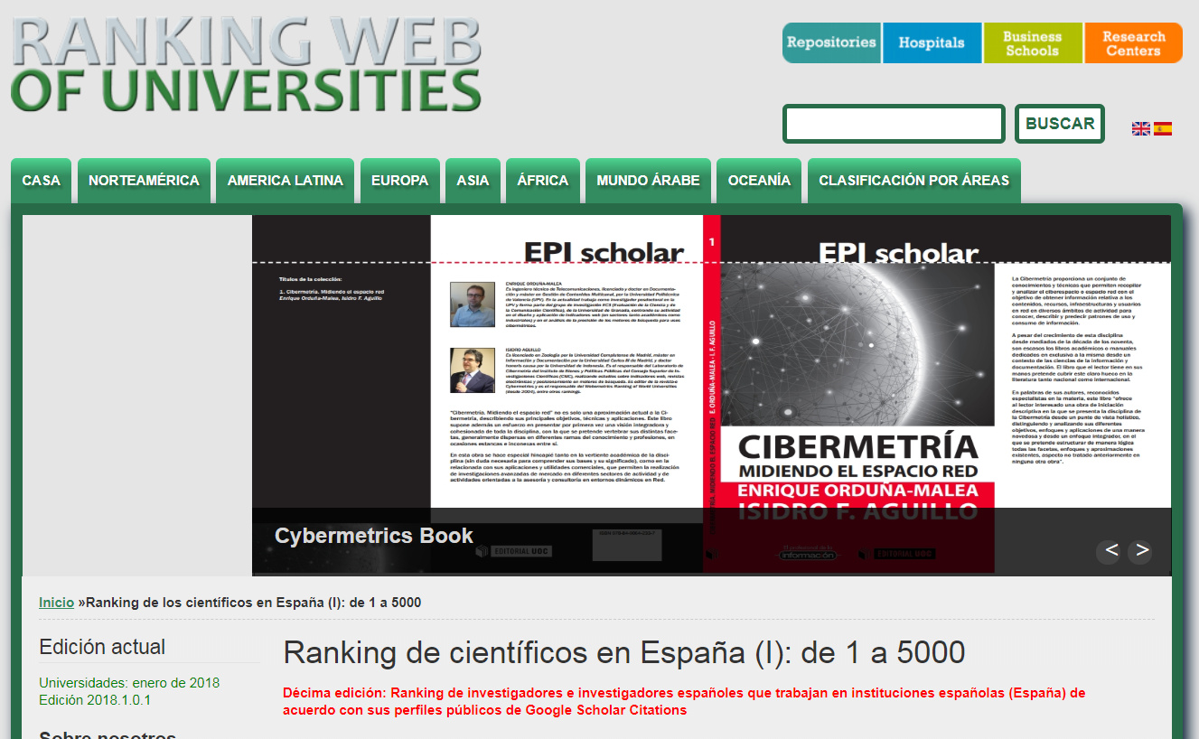 El «Ranking of Scientists in Spanish Institutions (Spain) according to their Google Scholar Citations public profiles«, acaba de actualizar (primera semana de junio) la lista de investigadores españoles de acuerdo con sus perfiles públicos en Google Scholar. En ella se recogen 52000 perfiles clasificados por el h-index en orden decreciente y luego por el número total de citas.