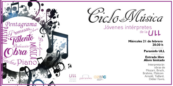 El Paraninfo de la Universidad de La Laguna será la sede del segundo concierto de 2018 de la programación anual del ciclo Jóvenes Intérpretes, que la institución académica programa junto al Conservatorio Superior de Música. El miércoles 21 de febrero las puertas de la sala abrirán a las 20:00 horas, dado que el recital comenzará a las 20:30 horas. Al igual que en otras ocasiones, la entrada será gratuita pero el aforo es limitado. En esta ocasión se interpretarán obras de Malcom Arnold, Georges Bizet, Didier Favre, Wolfang Amadeus Mozart, Max Bruch, Johannes Brahms y Joseph Haydn.