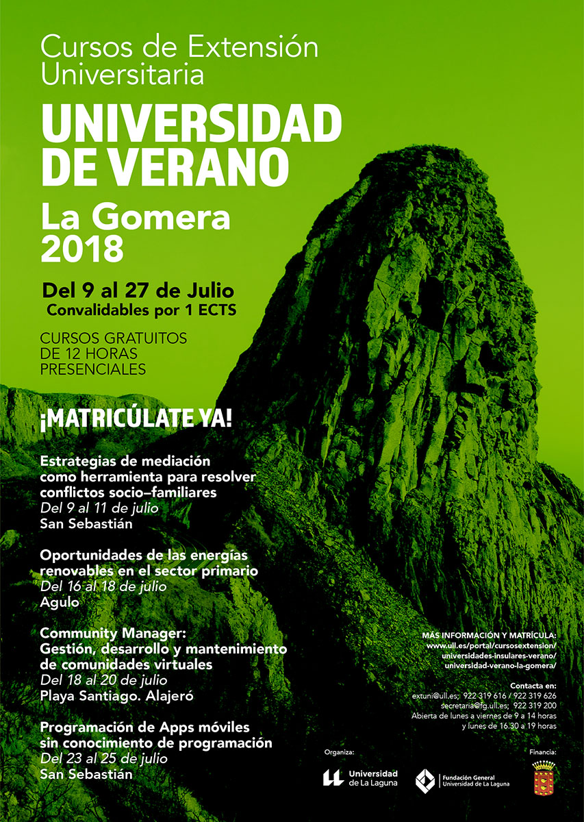 La oferta se dividirá en cuatro cursos repartidos por los municipios de San Sebastián, Agulo y Alajeró. La iniciativa, que cuenta con la organización de la Universidad de La Laguna y su Fundación General y la financiación del Cabildo de La Gomera, abordará diversos temas como la programación de apps, las oportunidades de las energías renovables en el sector primario, el rol profesional del community manager o las estrategias de mediación. Cada formación se extiende durante doce horas de duración y tiene un carácter eminentemente práctico.