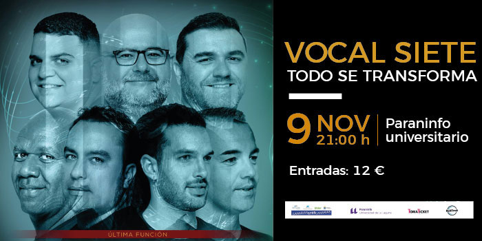 El grupo musical canario Vocal Siete estará este fin de semana en el Paraninfo de la Universidad de La Laguna (ULL) para desgranar los temas de su nuevo espectáculo Todo se transforma. La cita será hoy viernes, 9 de noviembre, a partir de las 21:00 horas.