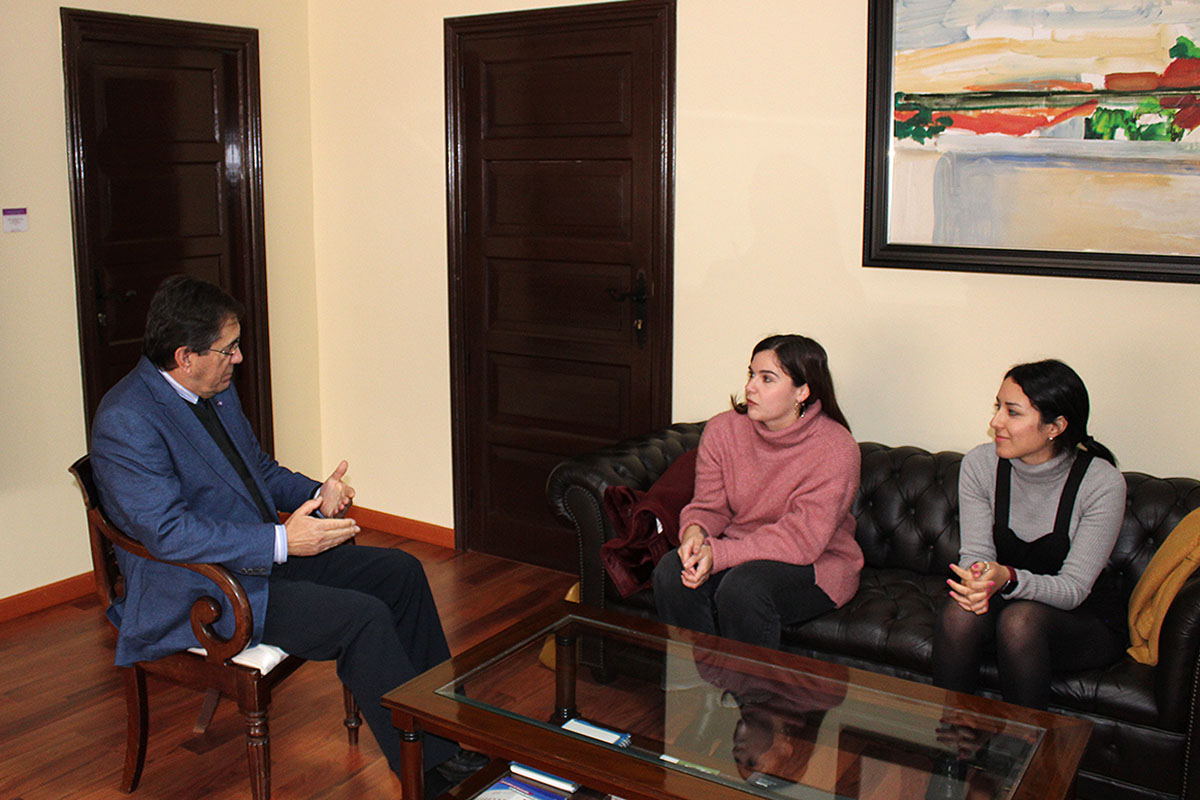 Las estudiantes del Grado en Diseño de la Universidad de La Laguna Magali Celene Silva Rosales y María Abreu Pérez han recibido recientemente sendos galardones nacionales por sus trabajos fin de grado y, por ello, el rector de la institución académica, Antonio Martinón, las recibió hoy, martes 22 de enero, para felicitarlas personalmente por sus éxitos. También estuvieron presentes en este acto informal el vicerrector de Estudiantes, José Manuel García Fraga, y el decano de la Facultad de Bellas Artes, Alfonso Ruiz Rallo.