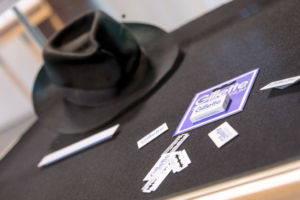 Nada más entrar, lo primero que puede verse es una vitrina relacionada con la obra más conocida de Espinosa, ‘Crimen’, el ejemplo más nítido y explosivo de la escritura surrealista en lengua castellana, en la que puede contemplarse unas cuchillas de afeitar, un cable eléctrico o un sombrero. “Con esto, pretendíamos recrear un ambiente surrealista con pequeños guiños de la obra. Queríamos sacar el contenido del libro fuera de él para que el visitante se impregnara del espíritu surrealista de su obra”, señala la comisaria.