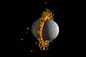 Simulación hidrodinámica de una colisión frontal de alta velocidad entre dos planetas de la masa terrestre. El rango de temperatura del material está representado por cuatro colores: gris, naranja, amarillo y rojo, donde el gris es el más frío y el rojo el más caliente. Tales colisiones expulsan una gran cantidad del material del manto de silicato dejando un planeta remanente de alto contenido de hierro y alta densidad similar a las características observadas de Kepler-107c. Crédito: Aldo S. Bonomo et al.