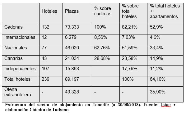 Respecto al número total de plazas hoteleras de Tenerife, algo más del 82% de las 89.197 camas hoteleras (73.333) están gestionadas por una cadena, frente al 18% restante de camas, que forma parte de empresas hoteleras independientes. Esto pone de manifiesto que las estructuras independientes son más pequeñas y de menor capacidad (15.863 camas).