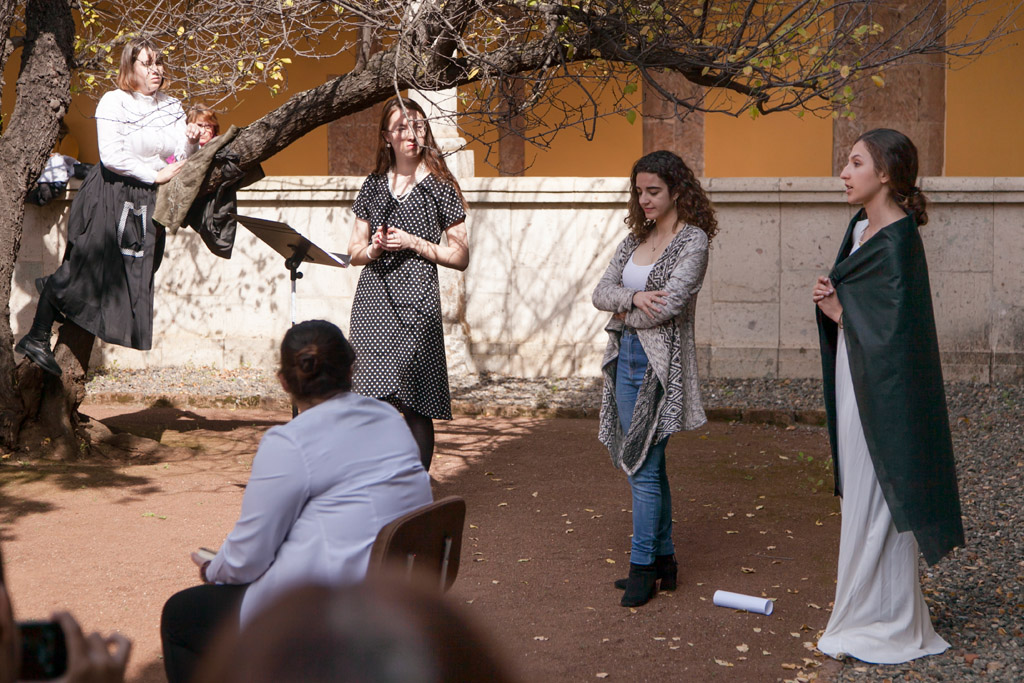 Tras la inauguración, la Agrupación de Teatro de Filología ofreció una pequeña representación en la que se daba la voz a varias investigadoras del pasado que narraron las dificultades que tuvieron que pasar para llevar a cabos sus trabajos.