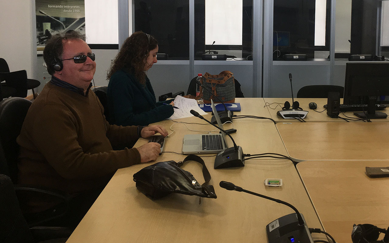 La semana pasada en el Máster de Interpretación de Conferencias contamos con la presencia de Jacques Salvador , intérprete freelance de cabina francesa con una larga trayectoria profesional. Jacques trabaja para Naciones Unidas y otros organismos internacionales y su combinación lingüística incluye, además del francés como lengua materna, el inglés, el ruso, el italiano y el español. Ha colaborado con nosotros ofreciendo discursos en francés para el alumnado, evaluando sus interpretaciones e impartiendo un seminario sobre su experiencia en el ámbito institucional. A cambio, aprovechó su visita en el MIC para ayudar a nuestros estudiantes y practicar el español, una de sus lenguas pasivas de trabajo.