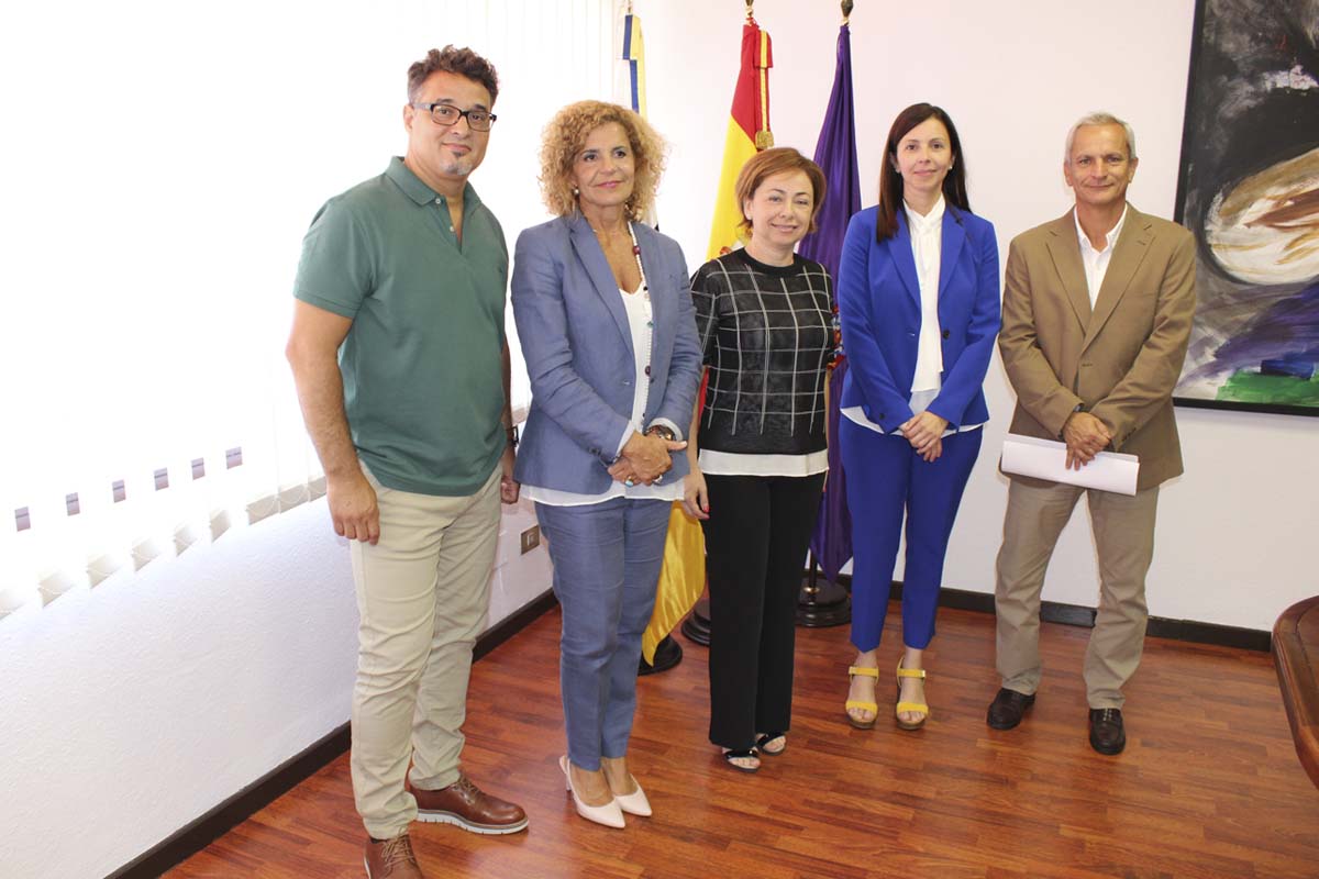 Norberto Marrero (camisa verde), Belén Melián (chaqueta azul oscura) y Manuel Díaz (chaqueta marrón), con la rectora y secretaria general.