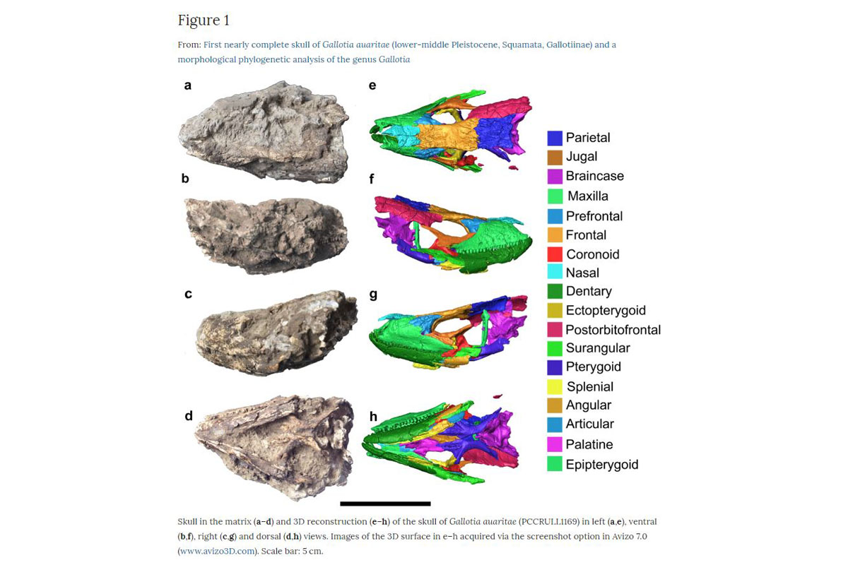 El estudio publicado hoy 12 de noviembre en Scientific Reports, de Nature, por un equipo multidisciplinar formado por investigadoras e investigadores del Consejo Nacional de Investigaciones Científicas y Técnicas, la Universidad Nacional de Río Negro, la Universidad de La Laguna, el Institut Català de Paleontologia Miquel Crusafont, la Universidad de Bristol y el International Centre for Theoretical Physics, se ha centrado en el análisis del primer cráneo fósil descubierto en La Palma de la especie Gallotia auaritae.