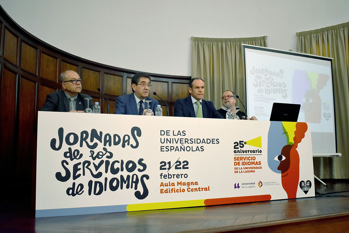 El rector de la Universidad de La Laguna, Antonio Martinón; el viceconsejero de Educación del Gobierno de Canarias, David Pérez-Dionis; el asesor de Política Lingüística y profesor de la Universidad de La Laguna, Plácido Bazo, y el director gerente de la Fundación General de la ULL, Julio Brito, fueron los encargados de dar la bienvenida a las personas que participarán en este encuentro, que se extenderá hasta mañana, viernes 22.