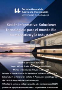El SEGAI les invita a la sesión informativa: Soluciones Tecnológicas para el mundo Bio-farmacéutico y la Industria, que tendrá lugar en el Salón de Grados de Farmacia el próximo martes 14 de mayo, de 11.00 a 13.00. La sesión se enmarca dentro del Symposium: «Advanced Systems for a better future» en honor al Dr. Nicholas A. Peppas, que tendrá lugar los días 15-16 de Mayo en la Facultad de Farmacia.