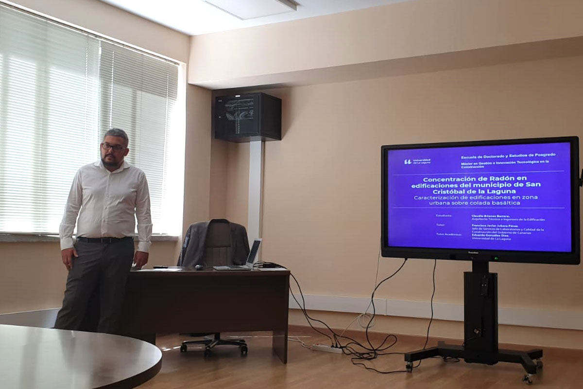 El graduado en Arquitectura Técnica por la Universidad de La Laguna Claudio Briones defendió recientemente su Trabajo Fin de Máster (TFM) titulado: “Concentración de radón en edificaciones del municipio de San Cristóbal de La Laguna. Caracterización de edificaciones en zona urbana sobre colada basáltica”. Para desarrollarlo colaboró con el Servicio de Laboratorios y Calidad de la Construcción del Gobierno de Canarias en una campaña de mediciones de los niveles de concentración de gas en viviendas del municipio de San Cristóbal de La Laguna.