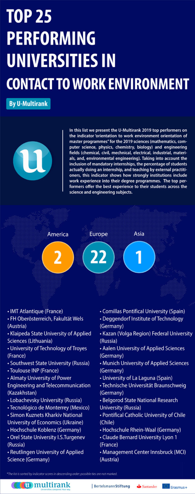El ranquin U-Multirank 2019 publicado recientemente evalúa a 1.711 universidades de 96 países midiendo diferentes indicadores y las valora en diferentes apartados. Seis universidades españolas han resultado incluidas entra las 25 mejores de todo el mundo en alguna de estas categorías. La Universidad de La Laguna es una de ellas, que ha destacado, concretamente, en el apartado correspondiente a “Contacto con el entorno laboral”, en el cual también ha sido citada la Universidad Pontificia de Comillas.