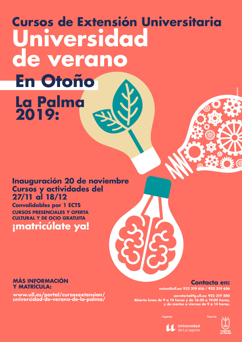 La iniciativa formativa Universidad de Verano en Otoño en La Palma prosigue esta semana su oferta con dos cursos que comenzará a impartirse mañana, miércoles 11, hasta el día 13 de diciembre, en diferentes sedes de la isla organizadora, para los cuales aún hay plazas disponibles con un coste de matrícula de 15€.