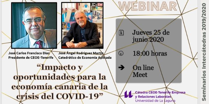 La Cátedra CEOE-Tenerife de Empresa y Relaciones Laborales de la Universidad de La Laguna ha organizado, dentro del marco del programa de Seminarios Intercátedras 2019/202”, dos citas en las que se analizará la incidencia de la crisis provocada por el COVID-19 en el sector empresarial canario. Concretamente, mañana jueves, 25 de junio a las 18:00 horas, se desarrollará el titulado “Impacto y oportunidades para la economía canaria de la crisis del COVID-19”, mientras que el próximo jueves 2 de julio a la misma hora se abordará la “Inteligencia económica ante la crisis del Covid-19”.