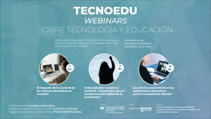 La Cátedra Fundación Mapfre Guanarteme de Tecnología y Educación de la Universidad de La Laguna, conocida también por las siglas TECNOEDU, ha organizado un seminario en línea que contará de tres sesiones que se celebrarán los días 2, 9 y 16 de diciembre, dedicadas a analizar el impacto de la pandemia generado en los diferentes niveles educativos y a reflexionar sobre la situación futura post-COVID-19.