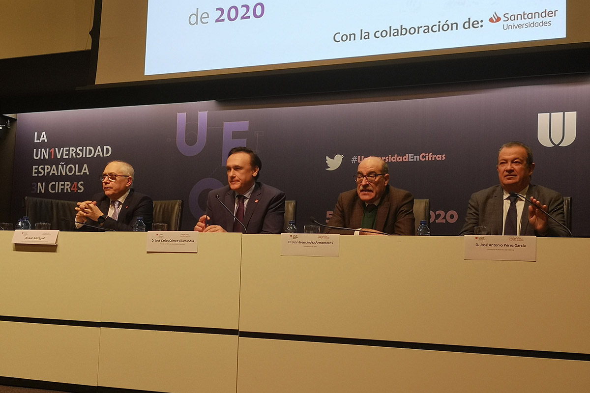 Crue Universidades Españolas ha presentado este miércoles, en el auditorio de la Fundación Ramón Areces de Madrid, el informe «La Universidad Española en Cifras. Año 2017 y curso académico 2017/2018». En la mesa presidencial, acompañando al presidente de Crue Universidades Españolas y rector de la Universidad de Córdoba, José Carlos Gómez Villamandos, han estado el presidente de Crue-Gerencias y rector de la Universidade da Coruña, Julio Abalde, y el director de Impacto Social de Santander Universidades, Javier López.