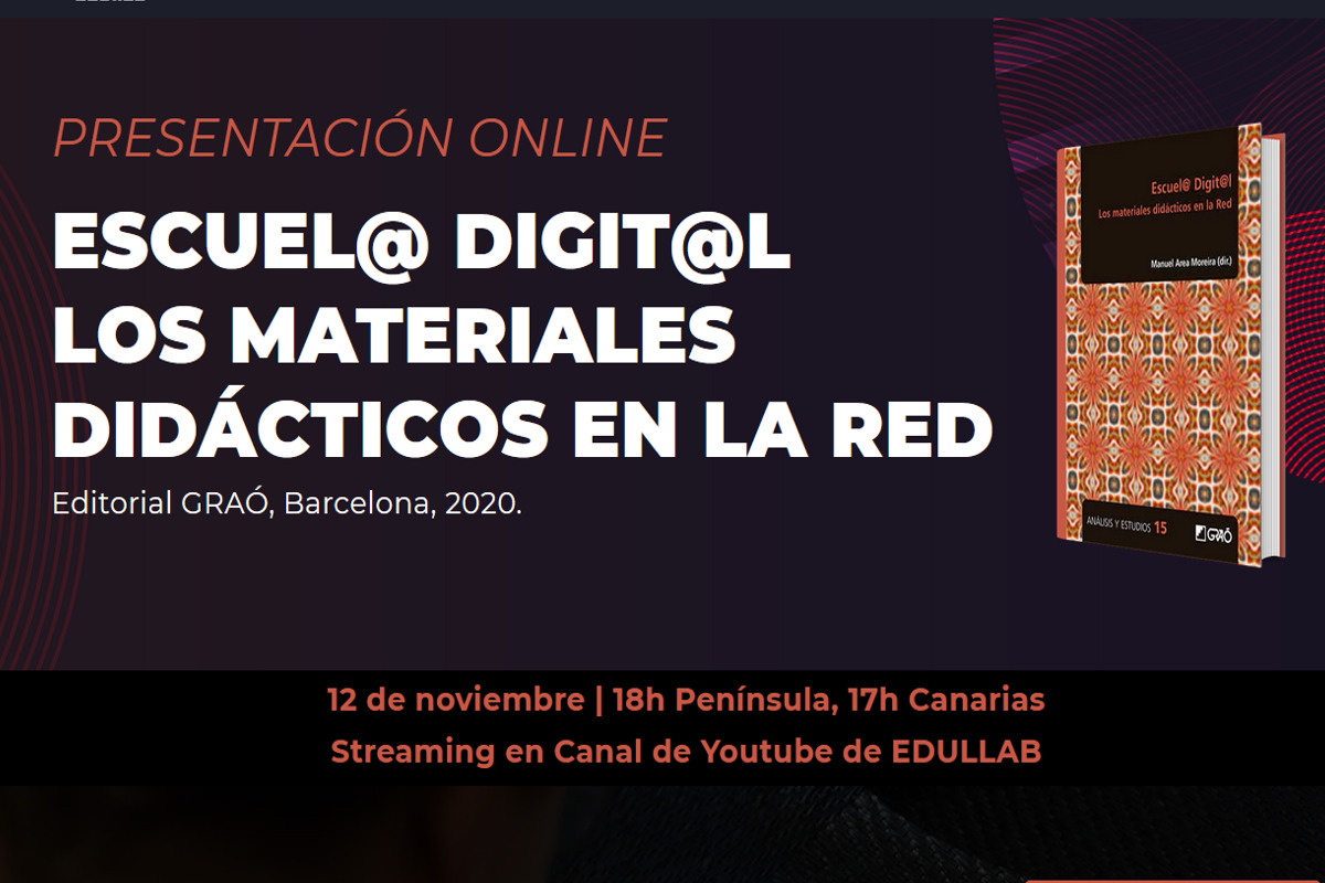 El Laboratorio de Educación y Nuevas Tecnologías de la Universidad de La Laguna (EDULLAB) presentará el próximo 12 de noviembre a las 17:00 (hora canaria) el libro “Escuel@ digit@l: los materiales didácticos en la red” publicado por la editorial Graó. La presentación se desarrollará de manera totalmente online con formato de webinar desde el canal de Youtube del grupo de investigación y se podrá seguir a través de Twitter con el hashtag #LibroEscuelaDigital.