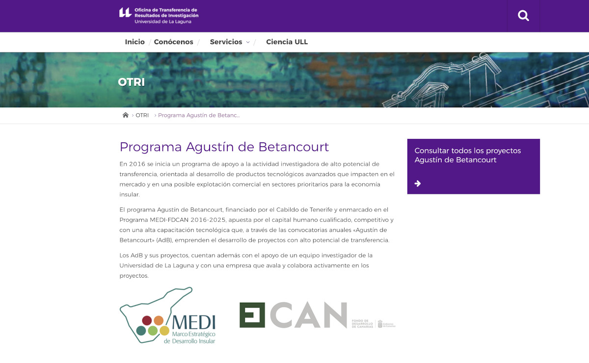 El Agustín de Betancourt, financiado por el Cabildo de Tenerife y enmarcado en el Programa MEDI-FDCAN 2016-2025, nace 2016 como programa de apoyo a la actividad investigadora de alto potencial de transferencia, orientada al desarrollo de productos tecnológicos avanzados que impacten en el mercado y en una posible explotación comercial en sectores prioritarios para la economía insular.