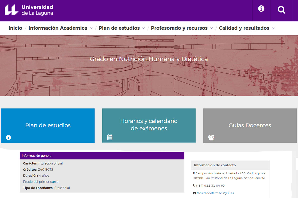 La Universidad de La Laguna ha publicado la web del nuevo título que el próximo curso académico se incorporará al catálogo del centro docente: Grado en Nutrición Humana y Dietética. Este título de cuatro años ofrece 60 plazas en nuevo ingreso y consta de 240 créditos. El periodo de prescripción aún no está abierto, se realizará con toda seguridad de forma telemática y será informado a través de la web institucional.