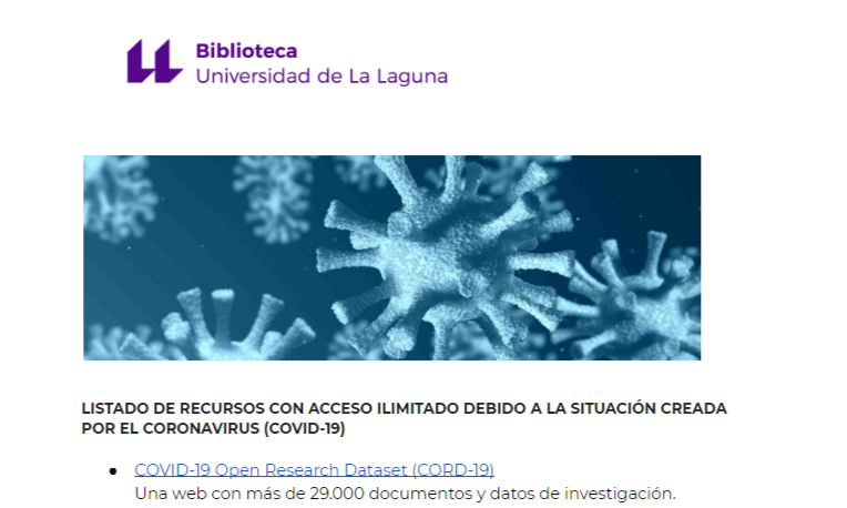 El personal de la Biblioteca sigue trabajando para facilitar el acceso de la comunidad universitaria a toda una serie de servicios en línea. Para apoyar la investigación en general, y en especial sobre el COVID19, los editores están permitiendo el acceso de forma gratuita a un mayor número de recursos. Compartimos a continuación con ustedes algunos de esos recursos a los que también pueden acceder desde este enlace que mantendremos actualizado.