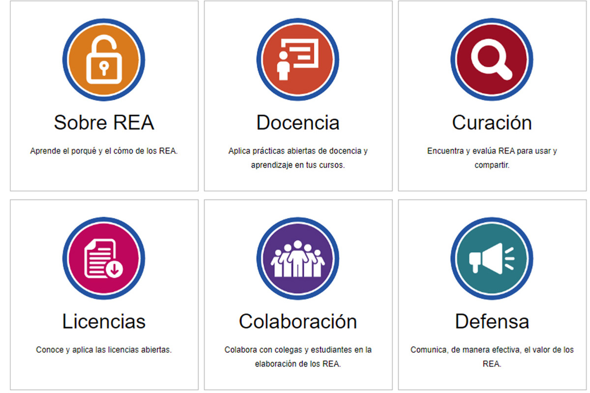 - Colaboración: estrategias para fomentar la colaboración e intercambio de REA entre profesorado, alumnado y personal de apoyo (biblioteca, diseñadores instruccionales, etc)