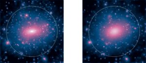 Materia oscura en dos galaxias simuladas en un ordenador. El trabajo sugiere que la materia oscura en galaxias reales se parece más a la imagen de la derecha, menos grumosa y más difusa que en la de izquierda.