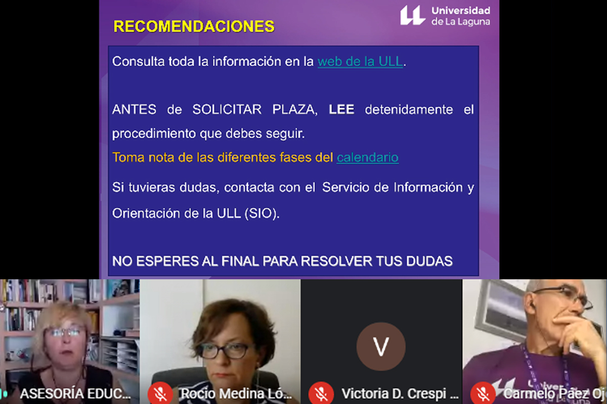 El Servicio de Información y Orientación de la Universidad de La Laguna ha celebrado hoy, miércoles 8 de julio, un seminario online que buscaba asesorar al alumnado a la hora de solicitar una plaza en un grado de esta institución académica. Dividido en cuatro sesiones horarias, este evento ha registrado más de un millar de inscritos y ha servido como piedra de toque para que el estudiantado, que procede eminentemente de la EBAU, conociera cómo puede acceder al procedimiento de inscripción.