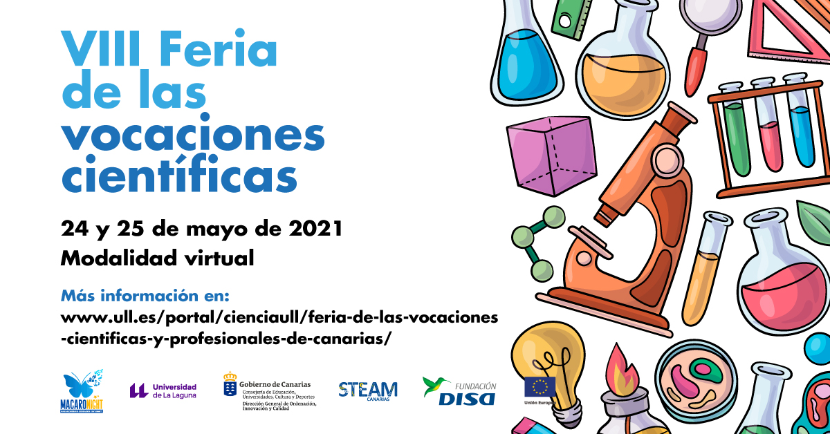 La Feria de Vocaciones Científicas y Profesionales de Canarias regresa este año con una gran cantidad de actividades destinadas a incrementar el interés de los y las jóvenes por la ciencia, la tecnología, la innovación y el emprendimiento para el desarrollo de su futuro profesional con la realización de un completo programa de actividades divulgativas (talleres, charlas científicas, stand demostrativos, etc.) dirigidas, principalmente, al alumnado de ESO, Bachillerato y Formación Profesional de los centros escolares de Canarias. En esta octava edición, la Feria se desarrollará en modalidad semipresencial, debido a las restricciones de seguridad establecidas para la prevención de la Covid-19, siendo las actividades dirigidas a los centros de carácter 100% virtuales y las de las familias semipresenciales. Mediante las plataformas Google Meet y YouTube se podrán seguir todas las actividades que se realizarán durante los días 24 y 25 de mayo.